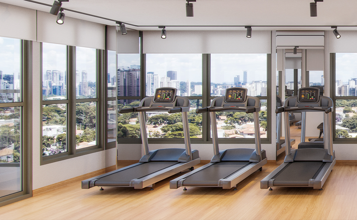 A academia é completa, equipada também com esteiras posicionadas lado a lado, todas voltadas para as janelas, garantindo que você possa aproveitar a vista enquanto corre ou caminha. O chão de madeira clara e a iluminação embutida no teto criam um ambiente acolhedor e bem iluminado.