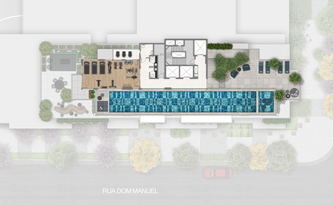 A implantação do rooftop do ALL CAMPO BELO é um espaço multifuncional que inclui áreas de convivência, academia, piscina e áreas de descanso, proporcionando um ambiente completo para lazer e fitness.