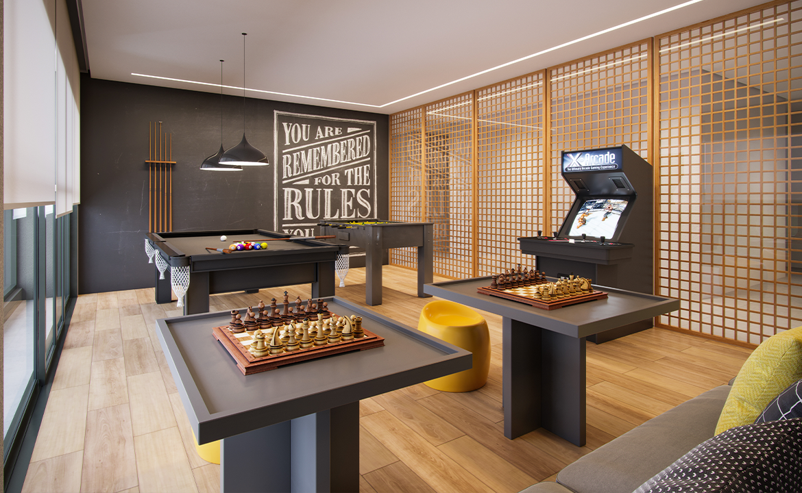 O salão de jogos é um espaço moderno e bem decorado. O ambiente possui um piso de madeira clara e é iluminado por luz natural que entra através de grandes janelas à esquerda.