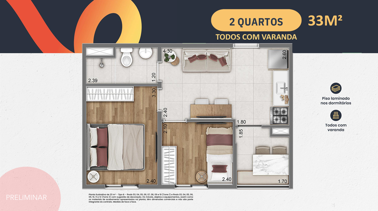 Apartamentos de 2 dormitórios com varanda grill.