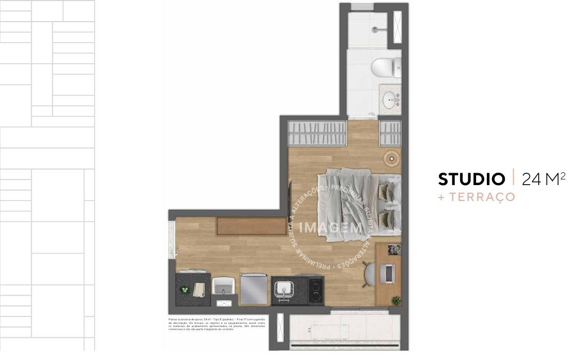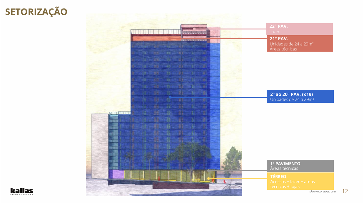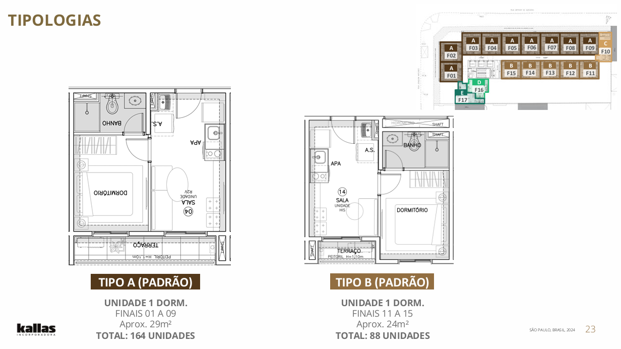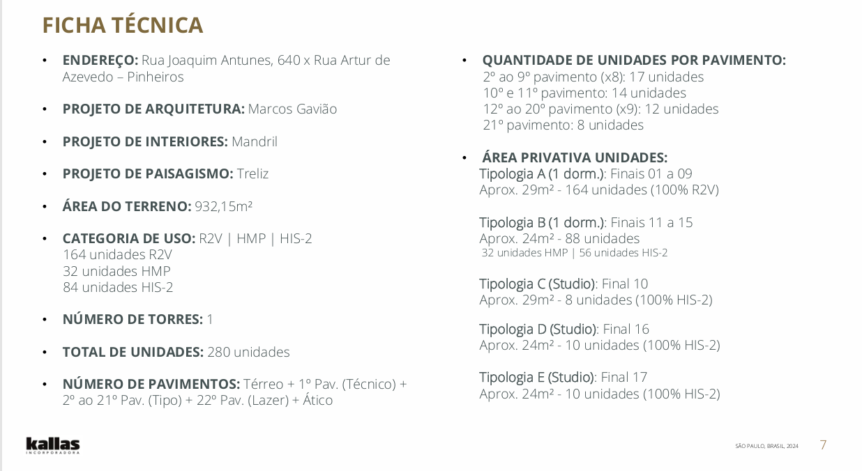 Composto por uma torre única com 280 unidades residenciais divididas entre 1 dormitório (tipologias variadas) e studios.