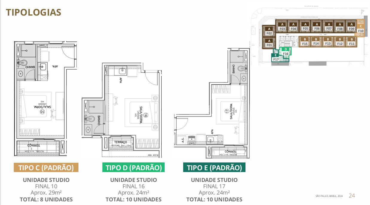 Tipologias A, B, C, D e E, adequadas a diferentes perfis de moradores.