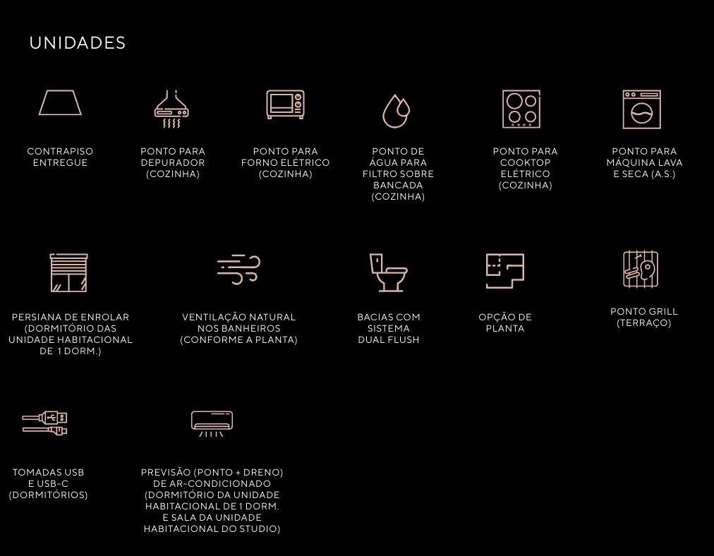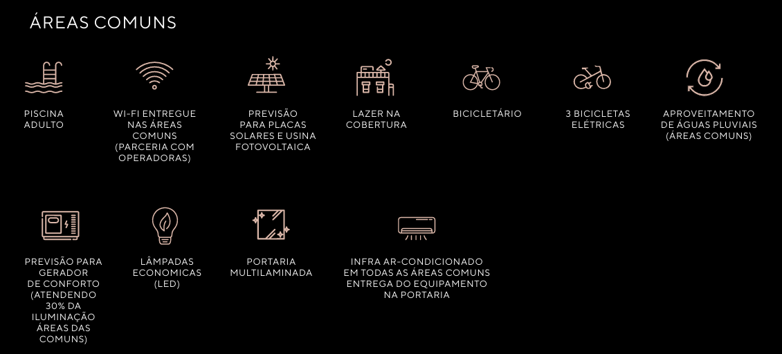 Infraestrutura moderna e sustentável: bicicletário, reaproveitamento de águas pluviais, previsão para placas solares, tomadas USB/USBC, e mais.