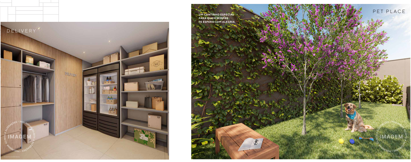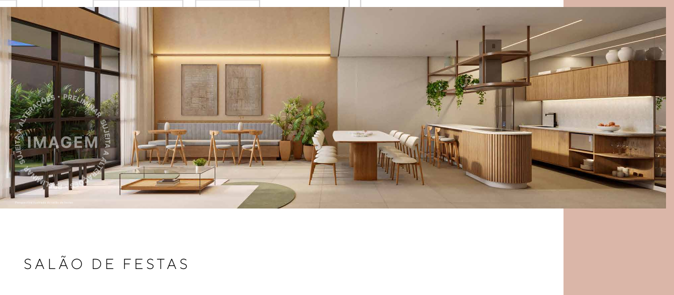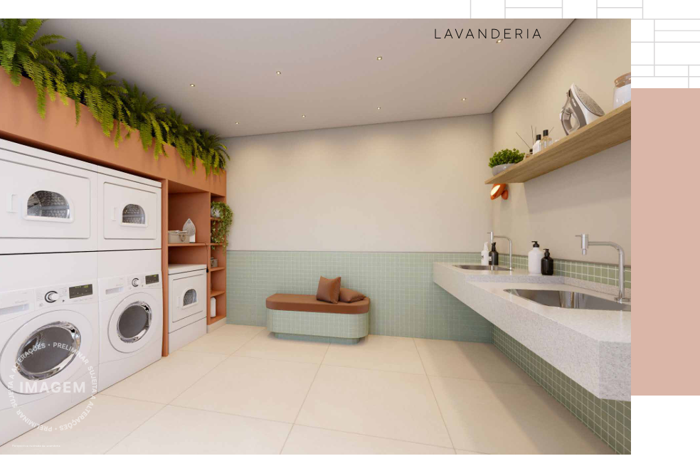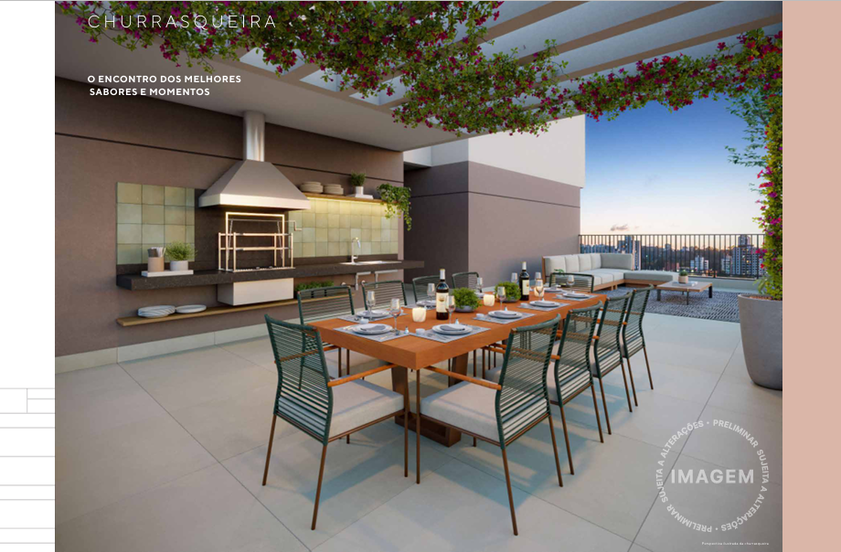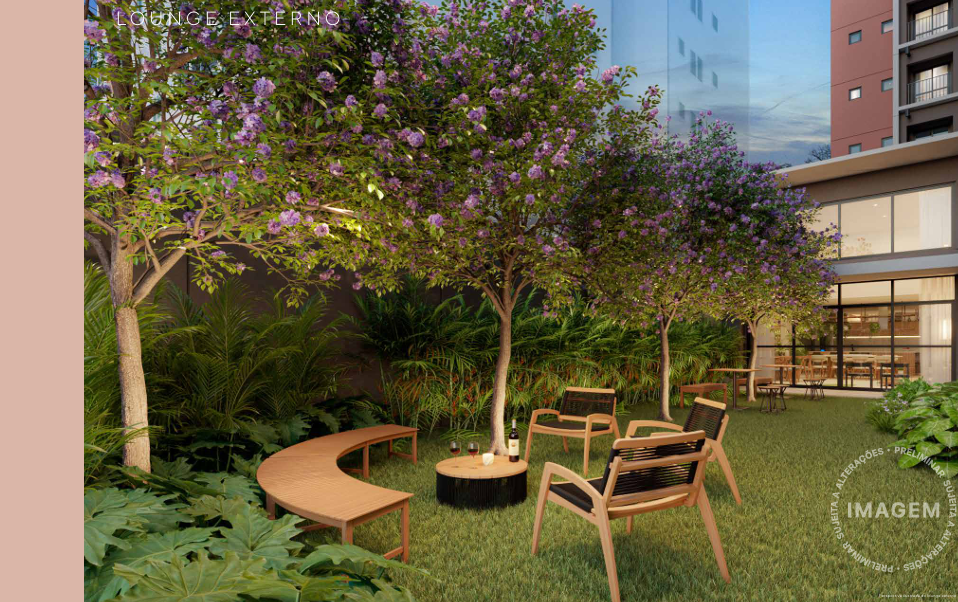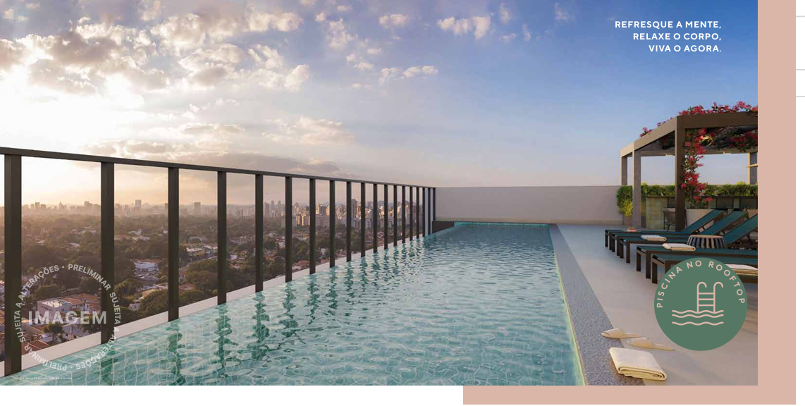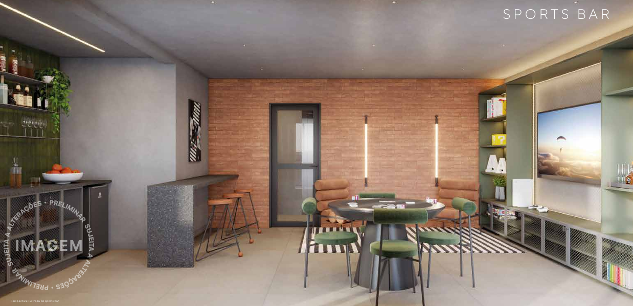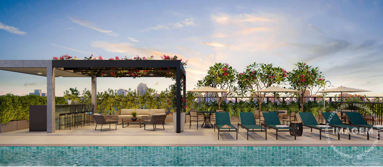 A cobertura é um verdadeiro refúgio urbano, com piscina, solário, academia e sports bar. Em sintonia com a modernidade, o prédio inclui soluções sustentáveis, como bicicletário, reaproveitamento de águas pluviais e previsão para placas solares. Áreas comuns entregues com Wi-Fi e iluminação em LED completam o pacote de inovação.