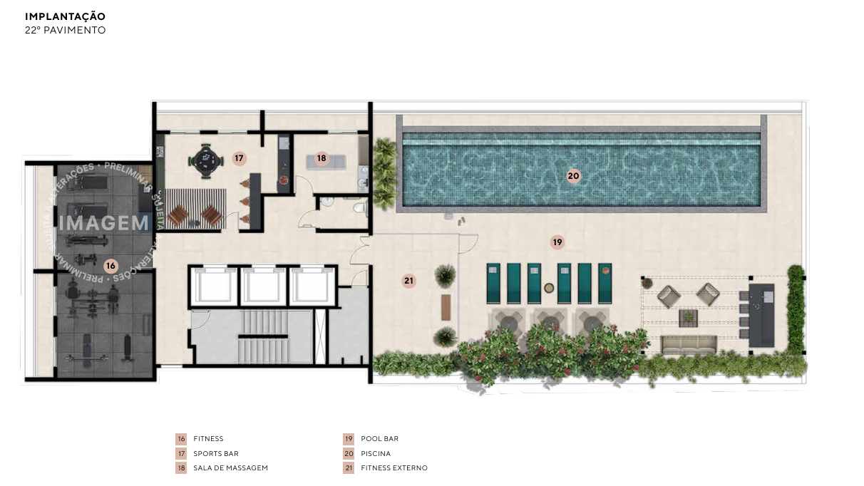 Andares incluem térreo, pavimentos tipo (2º ao 21º) e cobertura com área de lazer.