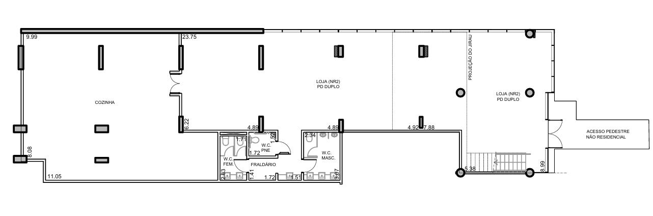 Cozinha de apoio e fraldário prontos, banheiros (masculino, feminino e PNE) dimensionados para alto fluxo, circulação fluida e acessibilidade total.
