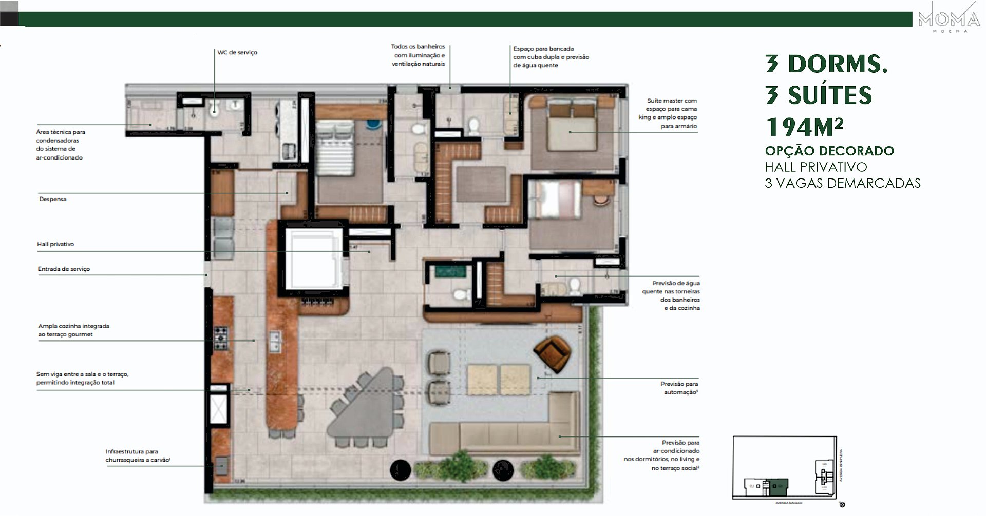 Além disso, o bairro de Moema oferece uma localização sem comparação, com infraestrutura de excelência, toda a conveniência das inúmeras lojas de rua e shoppings, gastronomia de referência, com restaurantes premiados e uma variedade de cafés e bistrôs que trazem um toque diferenciado ao bairro. As ruas planas e arborizadas fazem um convite a uma boa caminhada ao ar livre e o contato direto com a natureza próxima ao PARQUE DO IBIRAPUERA traz novas possibilidades para o dia a dia e para os fins de semana. Com tantas opções, você pode aproveitar uma tarde com os amigos, um almoço ou jantar com a família, e a liberdade de fazer tudo a pé torna cada experiência ainda mais especial e exclusiva.