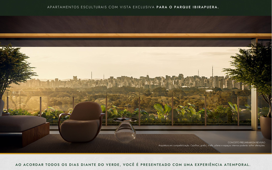 Apartamentos de 373 m² a 1.184 m², criados para almas grandiosas: Palcos de realeza contemporânea, com amplitude total para montar seu próprio palácio — Privacidade, sofisticação e uma vista infinita e exclusiva para o Parque Ibirapuera, como se o verde fosse a extensão natural do seu lar.
